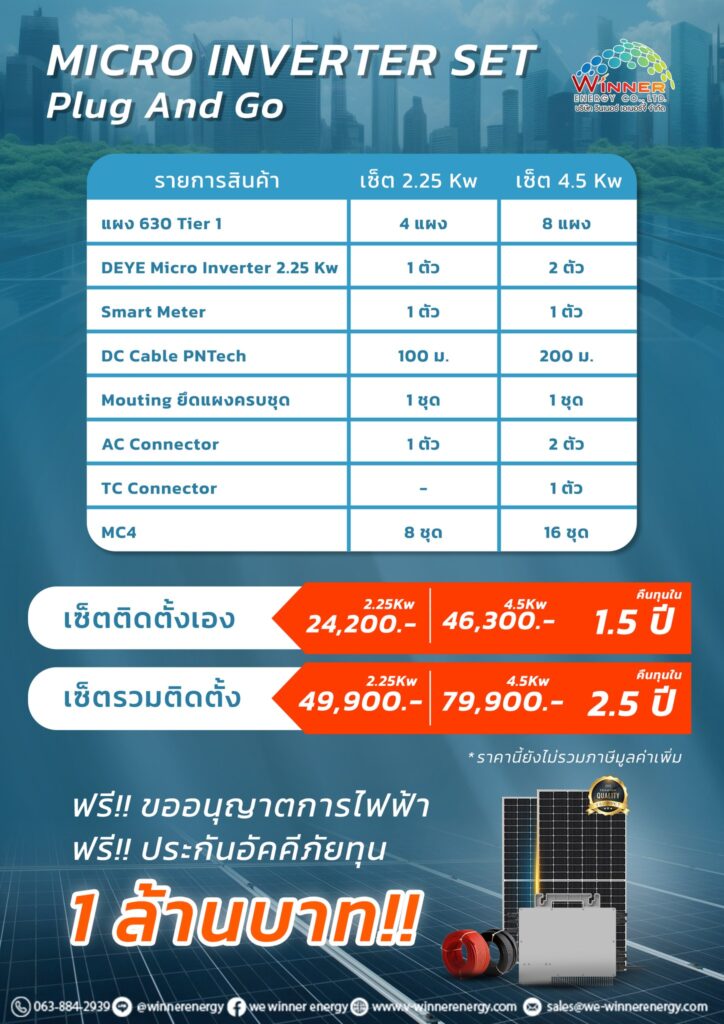 MICRO INVERTER SET Plug And Go Product List 2.25 Kw Set 4.5 Kw Set 630 Tier 1 Panel 4 Panels 8 Panels DEYE Micro Inverter 2.25 Kw 1 Unit 2 Units Smart Meter 1 Unit 1 Unit DC Cable PNTech 100 M. 200 M. Mounting Kit Complete Set 1 Set 1 Set AC Connector 1 […]